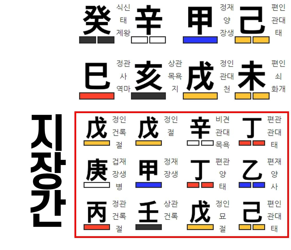 - 술(戌): 지장간은 '무(戊), 정(丁), 신(辛)' - 토(土), 화(火), 금(金)