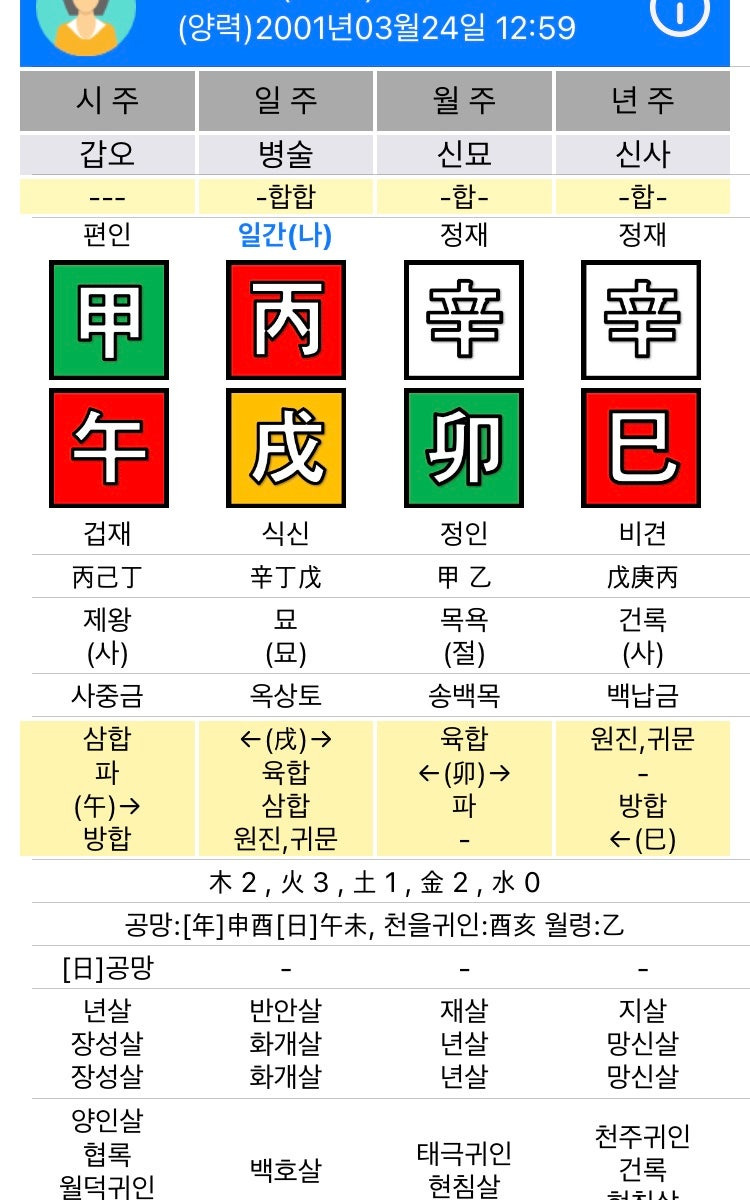 2. 시간(時干): 일간과 시지에 따라 시간(時干)을 계산합니다.