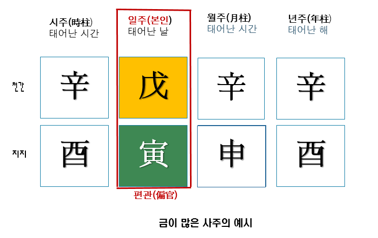 - 사주: 일간(경금), 월간(신금), 월지(유금), 연간(갑목), 연지(인목)