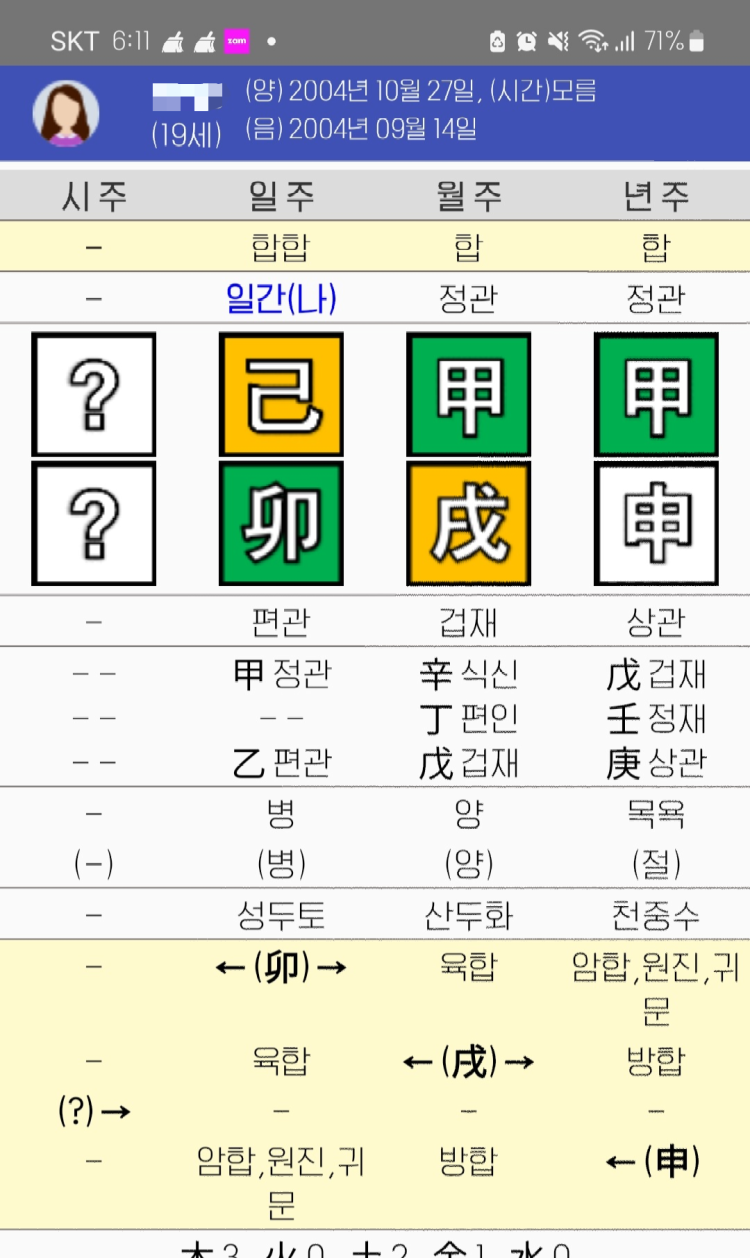- 천간의 충극: 예를 들어 일간이 갑목이고, 인성이 천간에 계수로 존재할 때, 병화(丙火)가 있다면, 병화는 계수를 극(剋)