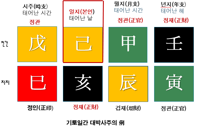 예를 들어, 어떤 사람의 사주가 다음과 같다고 합시다: