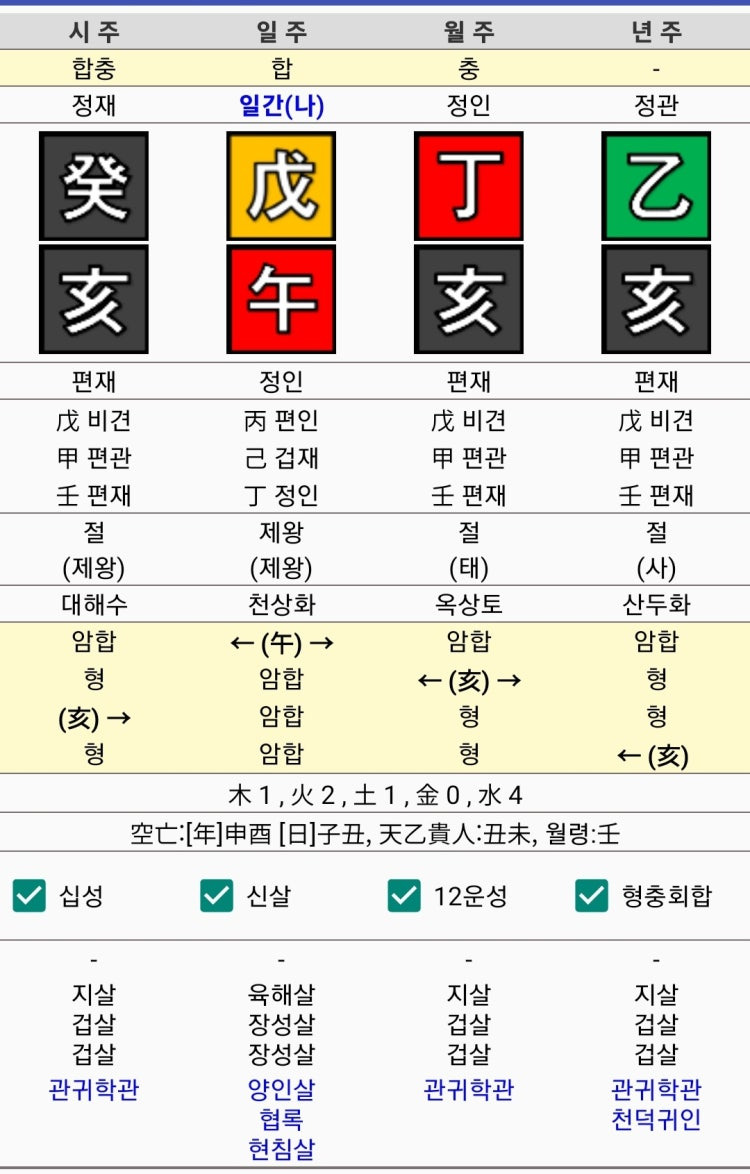 - 일간(日干) 파악: 일간은 사주의 중심이 되는 요소로, 사주 주인공의 본성을 나타냅니다.