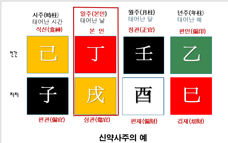 용신을 찾기 위해서는 먼저 사주의 구조를 이해하고, 각 기둥이 무엇을 의미하는지 파악해야 합니다. 예를 들어, 아래와 같은 사주팔자가 있다고 가정해봅시다.