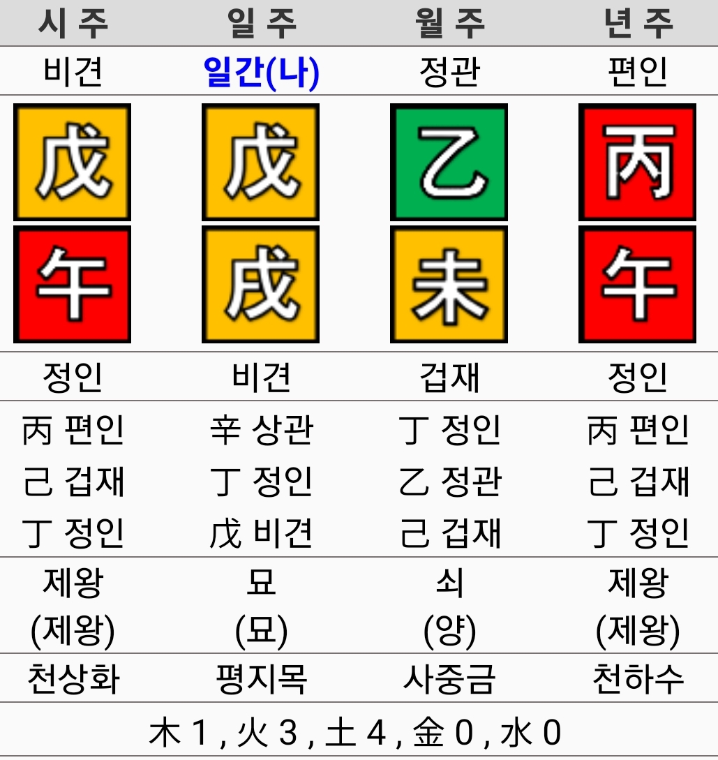 - 토(土): 일간이 무토이므로 토의 기운이 매우 강합니다.